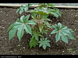 The plant grows throughout the tropical areas of India. In tropical regions the tree reaches the height upto 10-12 metres, whereas, in temperate regions a slender, woody, branching bush reaches upto 1-2 metres in height. The leaves alternate, palmately lobed with seven serrate lobes. The flowers monoecious, male flowers shortly stalked and female ones, sessile. The fruits are blunt, greenish, tricoccus capsules. The seeds are ovoid, flattened, shining and pinkish-grey in colour.